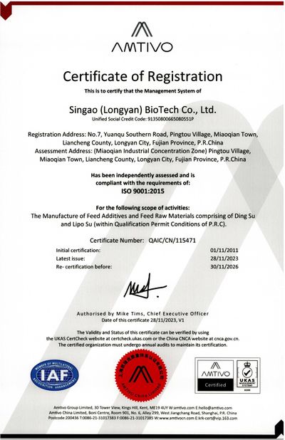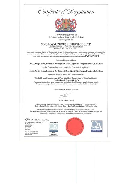 ১. সিঙ্গাও ISO9001:2008 এর গুণমান সিস্টেম দ্বারা পরিচালিত হয়; এটি HACCP, GMP+ নীতি অনুসরণ করে উৎপাদন সংগঠিত করে